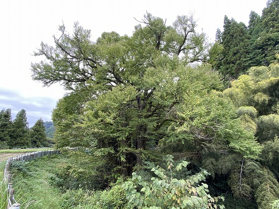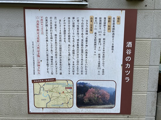 | 概要 | 胸高幹周り9.85m、樹高19.2m。推定樹齢500年、大小8本の支幹からなり、姿がヤマタノオロチを想像させる事から「オロチカツラ」と呼ばれている。カツラは、タタラの神様・金屋子神の飛来木といわれる。 2013(平成25)年4月9日、県の天然記念物に指定。日本遺産「神々や鬼たちが躍動する神話の世界〜石見地域で伝承される神楽〜」の構成文化財。 |