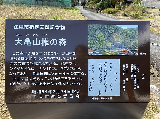 樫15本・タブ3本。福応寺八世住職による植林と伝えられており、市内最古の人工林となる。 1979(昭和54)年2月24日、市の天然記念物に指定。 |