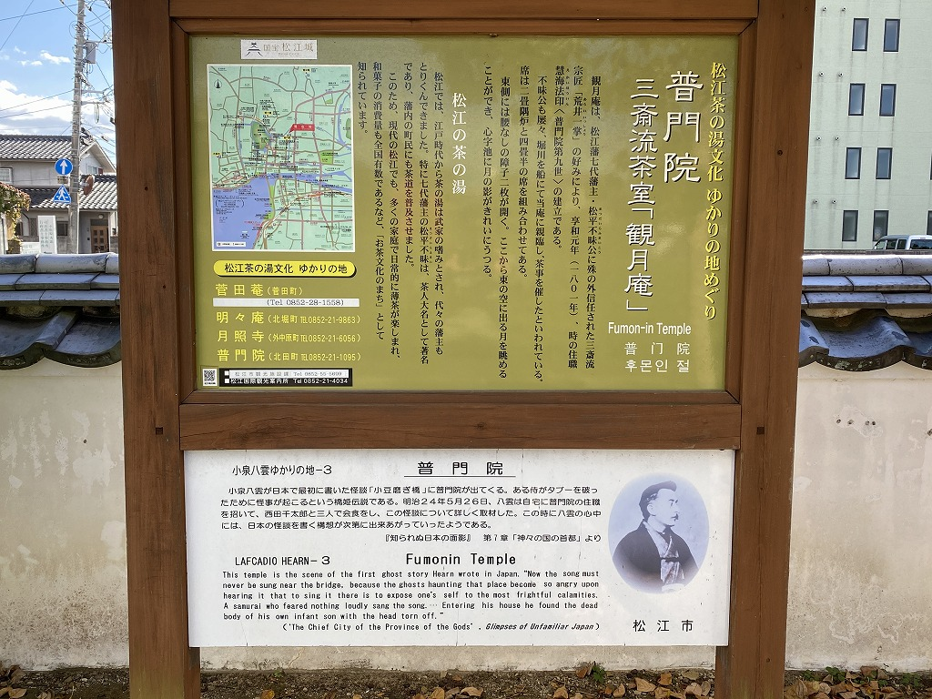 江戸時代の初め、堀尾吉晴によって開創された寺院。小泉八雲の怪談「小豆とぎ橋」で普門院が登場する。明治24年5月26日、八雲は自宅に普門院の住職を招き、怪談について取材した。 |