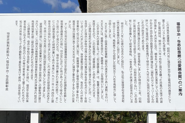 | 概要 | 1棟。木造二階建。キングポストトラスの洋小屋組。外壁上半分はドイツ壁風モルタル仕上げ。縦長窓と急勾配の切妻屋根。鉄板葺。建築面積73平米 社会福祉事業の先駆者・福田平治によって、育児院の講堂・礼拝堂として建てられた。 2017(平成29)年5月2日、国の登録有形文化財(建造物)に登録。2022(令和4)年3月1日、松江市登録歴史的建造物第17号に登録 |
