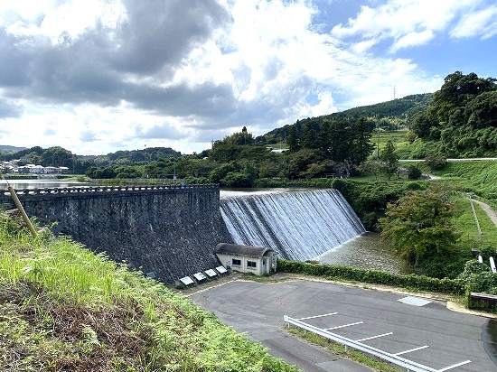 概要 | 忌部川に造られた山陰初の近代水道施設で、現在も活用されている。溢流式直線重力粗石コンクリートダム(外側は石張)で、副堰堤の外側には石造りの4つのアーチを持つ管理橋がある。高さ15.76m・長さ約109.09m。 2008(平成20)年5月7日、国登録有形文化財(建造物)に登録。2003(平成15)年度、土木学会選奨土木遺産に認定 |