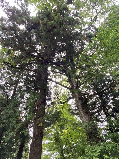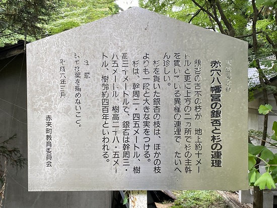 | 概要 | 樹高約30m・樹齢400年の銀杏の枝が、地上10mのところで隣に立つ杉の主幹を貫く。異種同志の連理は大変珍しい。 1994(平成6)年3月1日、町の天然記念物に指定。 |