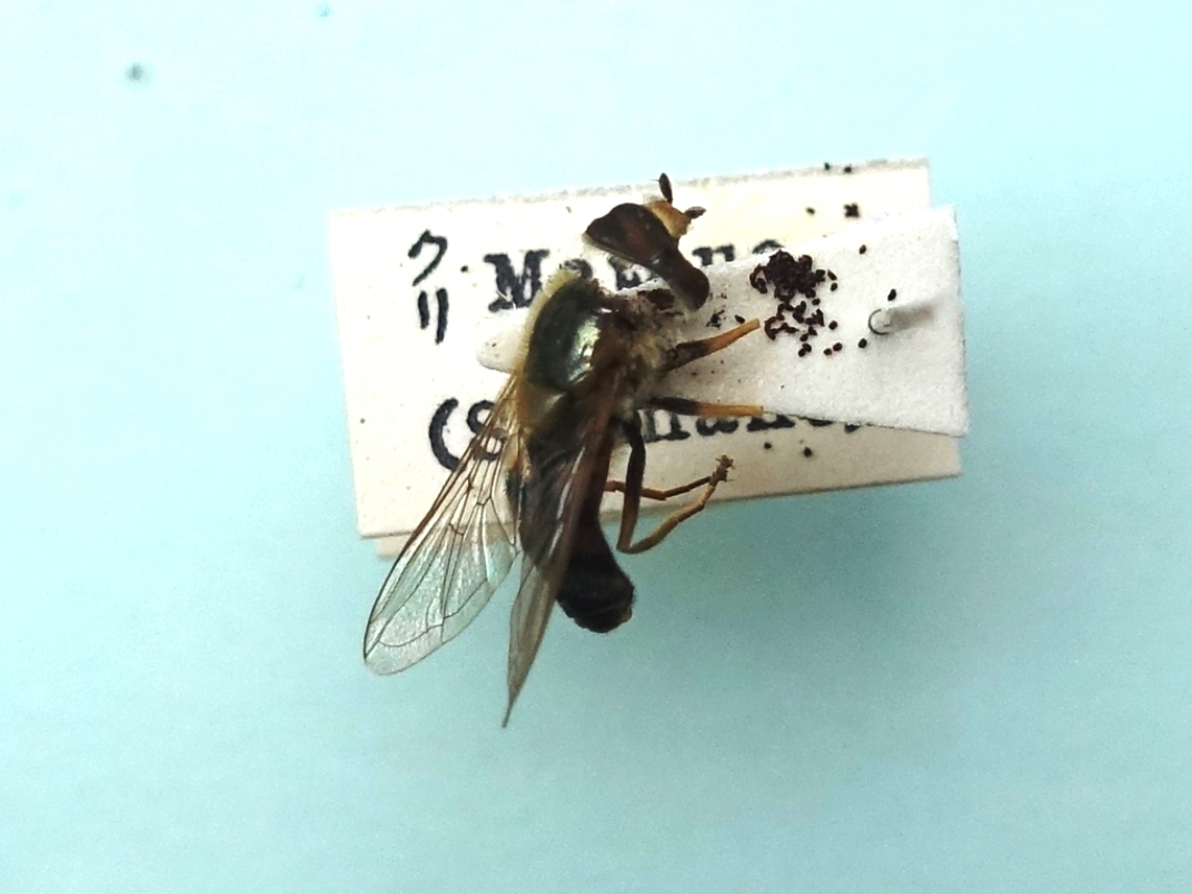 ♂。ハエ目ハナアブ科ヒラタアブ亜科 ラベルの採取地に「クリ」の表記あり。ラベルでは「Metasyrphus corollae (FABRICIUS)」と記載。 別ラベルに、「Det. K.Ohata 1979」とあり。 平成23年度、生物資源科学部から島根大学ミュージアム(現:島根大学総合博物館)に移管。 |